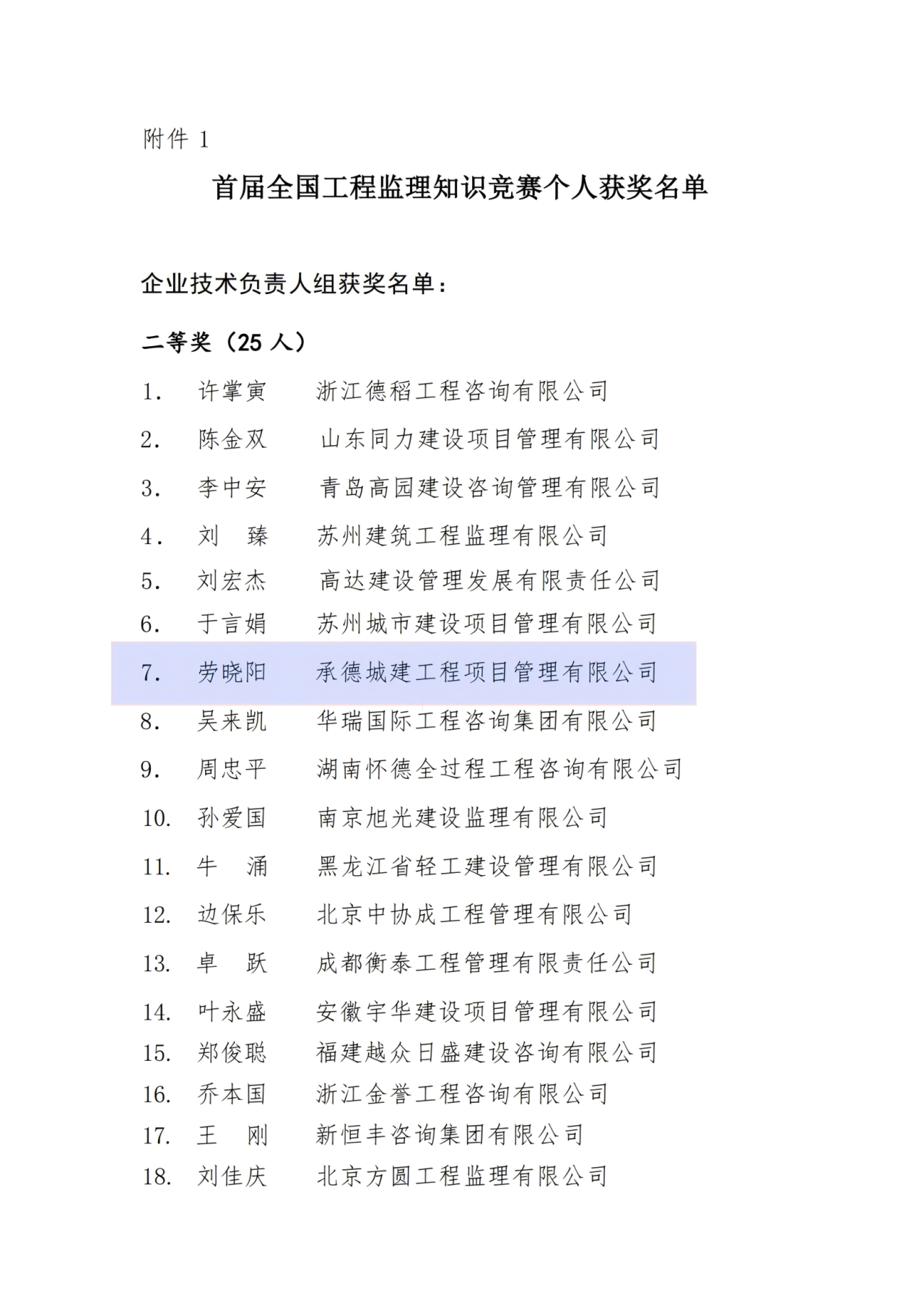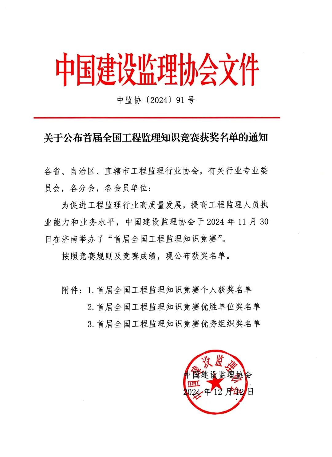 熱烈祝賀承德城建工程項目管理有限公司在首屆全國工程監理知識競賽中榮獲“全國優勝單位獎”! 我們的勞曉陽同志更是在企業技術負責人組中榮獲二等獎,展現了承德城建的卓越實力和奮斗精神!